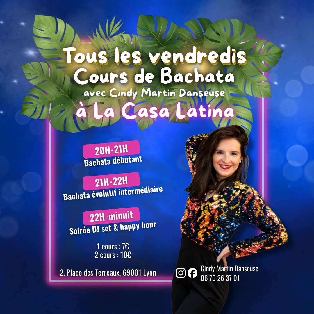 Je suis Cindy, professeur de danse en BACHATA, SALSA, KIZOMBA et ROCK depuis 2011 en région lyonnaise. Je donne des cours de danse individuels, collectifs ou en entreprises pour tous niveaux.