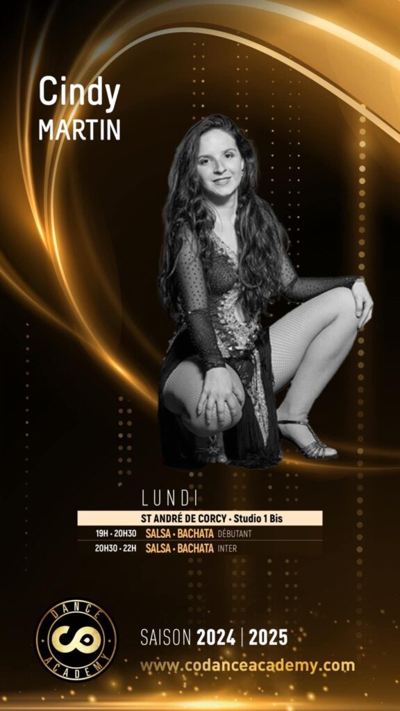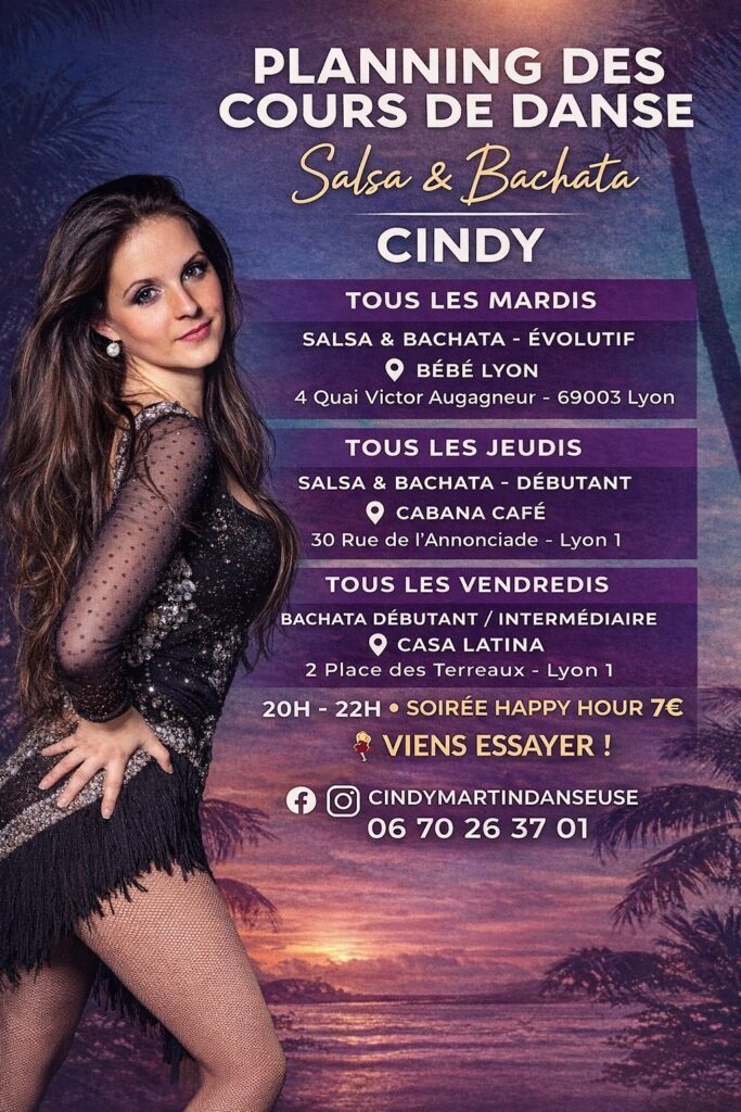Rejoignez Cindy Martin, professeure de danse expérimentée, pour des cours collectifs de Salsa et Bachata à Lyon. Que vous soyez débutant ou danseur confirmé, Cindy vous guide avec passion et pédagogie pour vous faire progresser rapidement tout en vous amusant.
